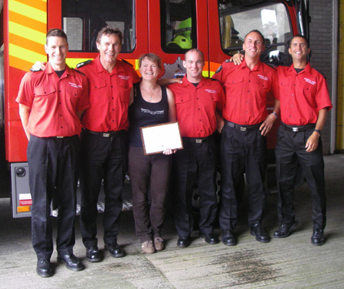 As part of her reward for raising most sponsorship money through the Ladies Driving Challenge, Carolyne was treated to a VIP tour of Falmouth Community Fire Station and spent the day with the duty crew taking part in operational training and getting an insight into a career in the fire service. She spent the day with Blue Watch and took part in drills that covered Search and Rescue (breathing apparatus), practical pumping (water and hoses), and line rescue at Pendennis Point. She was presented with the President’s Award on behalf of CFRS and The Fire Fighters Charity for the sponsorship money she raised for the 2010 Ladies Driving Challenge.