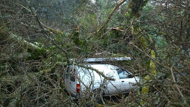 At 16:27 this afternoon a call was received to a large tree which had fallen onto a van on the A3038. The vehicle was being driven at the time and fire crews said it was a miracle that the vans occupant was not injured. Fortunately when the tree fell large branches came down around the main body of the van leaving the driver unharmed. Due to the size of the tree the A3038 has been blocked and remains closed whilst the tree is removed, the van has been left in situ.