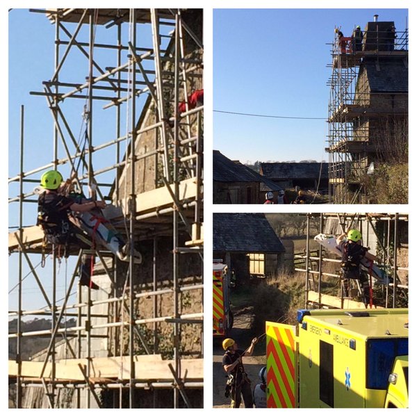 Ten firefighters on an appliance from Lostwithiel and specialist Rope Rescue appliance from Bodmin attended a call to a male who had been injured on the fourth lift of scaffolding around a house and was unable to get down. Firefighters allowed the casualty to be assessed by Ambulance paramedics before attempting the rescue from the scaffolding. Whilst the casualty was assessed the line rescue team from Bodmin prepared their equipment for the rescue. Bodmin Line rescue team and Ambulance paramedics prepared the casualty for movement on a dragon stretcher. Ropes and lines were used to create an anchor around the chimney stack; the casualty was then lowered from the scaffolding to the ground. Once on the ground the casualty was left in the hands of the paramedics as crews made their kit up.