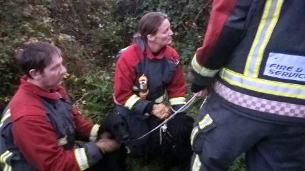 A call was received by the Critical Control Centre from a walker who could hear dogs barking from an overgrown quarry. The nearest appliance from Falmouth along with an Officer were mobilised and on arrival they requested the line rescue vehicle from Tolvaddon and Water Rescue from Falmouth, a further Technical Rescue Officer was also mobilised. At this particular time the owners of the dogs were not on scene, so the RSPCA were also requested. The crews attempted to reach the dogs by inflatable boat but this was unsuccessful, as it then became clear the dogs were stuck on a ledge above the quarry and not visible from the top. They then set up rescue lines and were able to rescue the dogs from above with the assistance of the water technicians below. The dogs were wearing identification collars with contact numbers attached and the owners were soon on scene to be reunited with their pets.