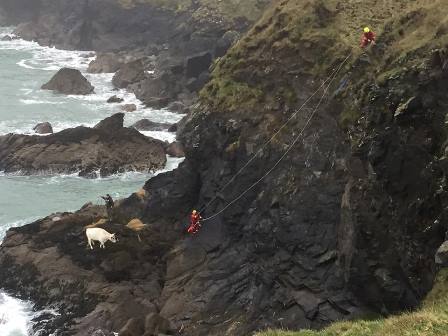 Specialist animal rescue crews from Bodmin Community Fire Station and further crews from Wadebridge have attended a call to a rare breed White Park cow who is in calf that had gone over the cliff and on to the rocks below some 40ft down. The crews had to await the attendance of a vet and rifleman to sedate the cow prior to being able to carry out the rescue. They, and some members of the crew where then lowered to the rocks.